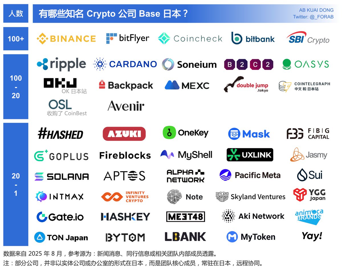 目前,在日本的华人币圈全职从业者,预计在大百人附近,其中如 Binance、Backpack、OSL、OK Japan、SBI 财团及下属做市商或基金,以及在东京的二级交易团队们,承接了大量的雇员。