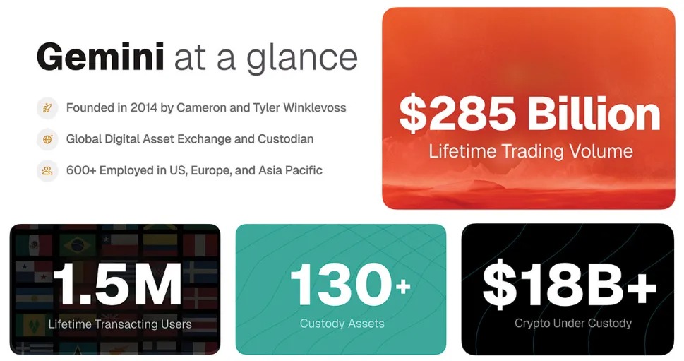 按数据商Kaiko的口径,按交易量计Gemini为美国规模较大的加密交易平台之一,现有托管资产约180亿美元,历史累计成交额约2850亿美元。业务涵盖场外交易(OTC)、面向美国的信用卡,以及比特币、以太币与多种稳定币等资产的交易,服务对象包括散户与机构,主要收入来自按成交量计费的交易手续费。