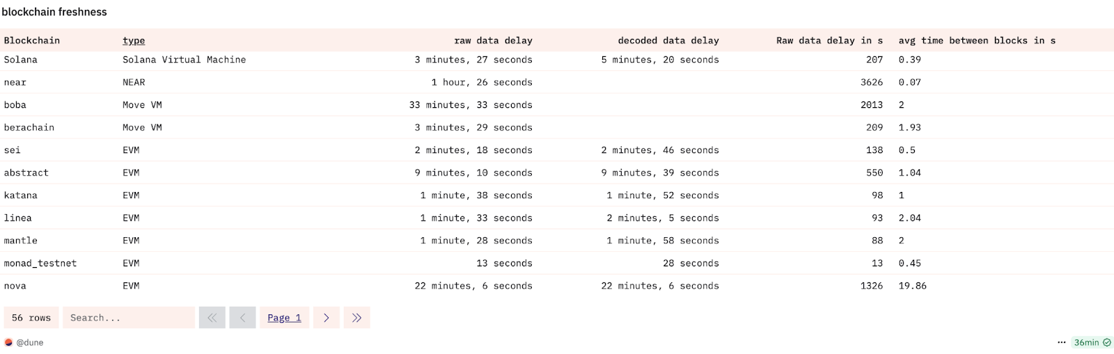 然而,下游数据基础设施大多仍依赖批处理 ETL 管道,不可避免地存在数据延迟。以 Dune 为例,Solana 上的合约交互事件数据通常延迟约 5 分钟,而协议层聚合数据甚至需等待 1 小时。这意味着,用户本可在 400ms 内被确认的链上交易,却要延迟数百倍才能在分析工具中可见,对实时交易类应用而言几乎不可接受。