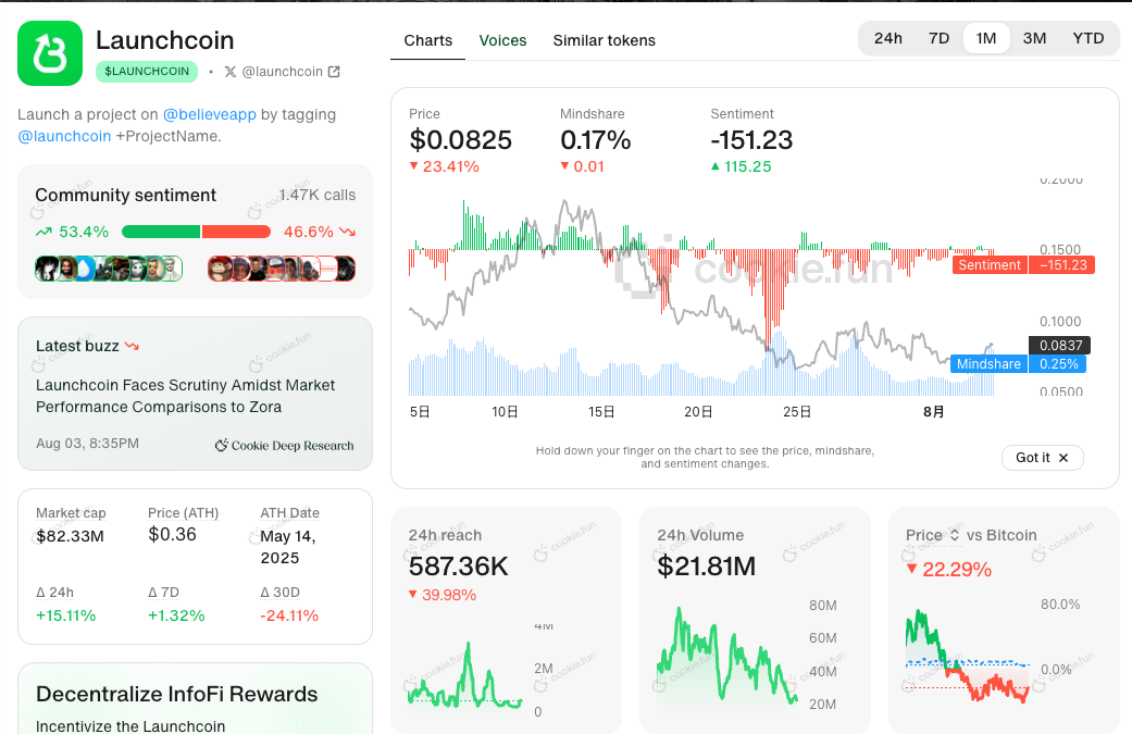 Kaito 和 Cookie.fun 等 Infofi 工具对 Crypto Twitter 做内容做聚合与舆情分析,给出 Mindshare、 Sentiment、Influence 的可量化指标。以 Cookie.fun 为例,其将 这两项指标数据直接叠加到价格图表上,把链下情绪变成可读的“技术指标”。