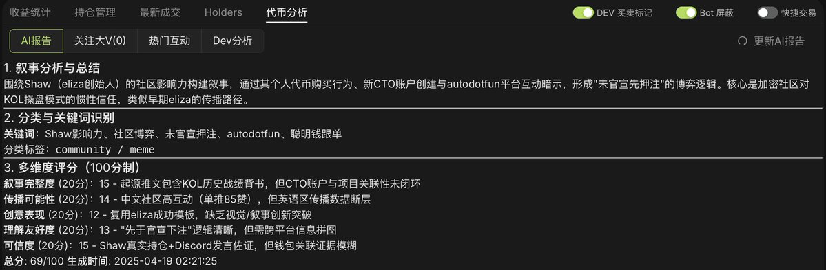 在 Twitter 等社交平台,诸如 XHunt 的小工具可帮助 Meme 玩家分析项目的 KOL 关注列表,以判断项目背后的关联人以及潜在注意力传播链。6551 DEX 通过聚合推特、官网、推文评论、发盘记录、KOL 关注等,为交易者生成完整的、随舆情实时变化的AI报告,帮助交易者精准捕捉叙事。