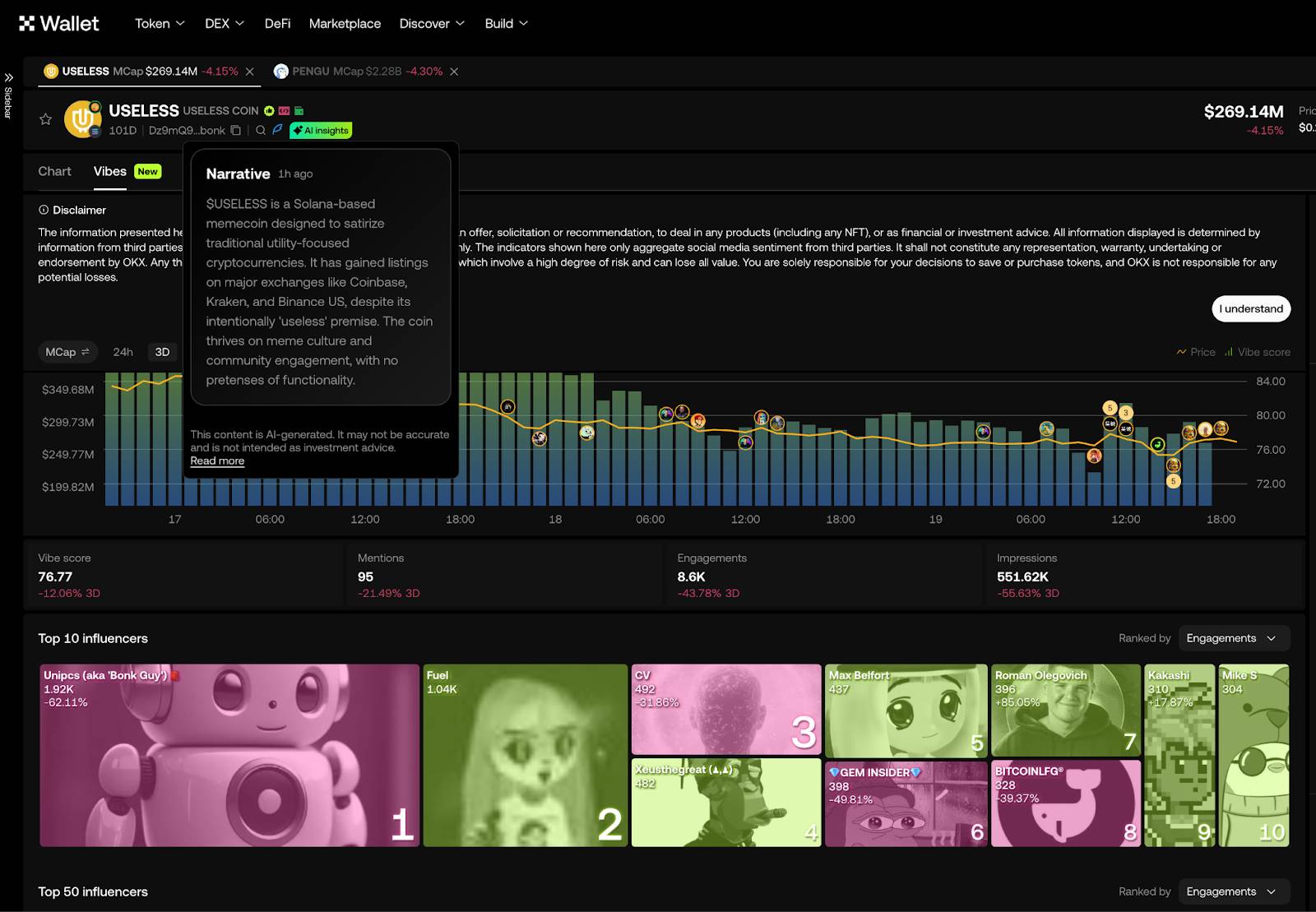 OKX DEX 在产品上将 Vibes分析与行情并列展示,聚合 KOL 喊单时间点、头部关联 KOL、Narrative Summary 与综合打分,缩短链下信息检索时间。Narrative Summary 已然成为用户反响最好的 AI 产品功能。