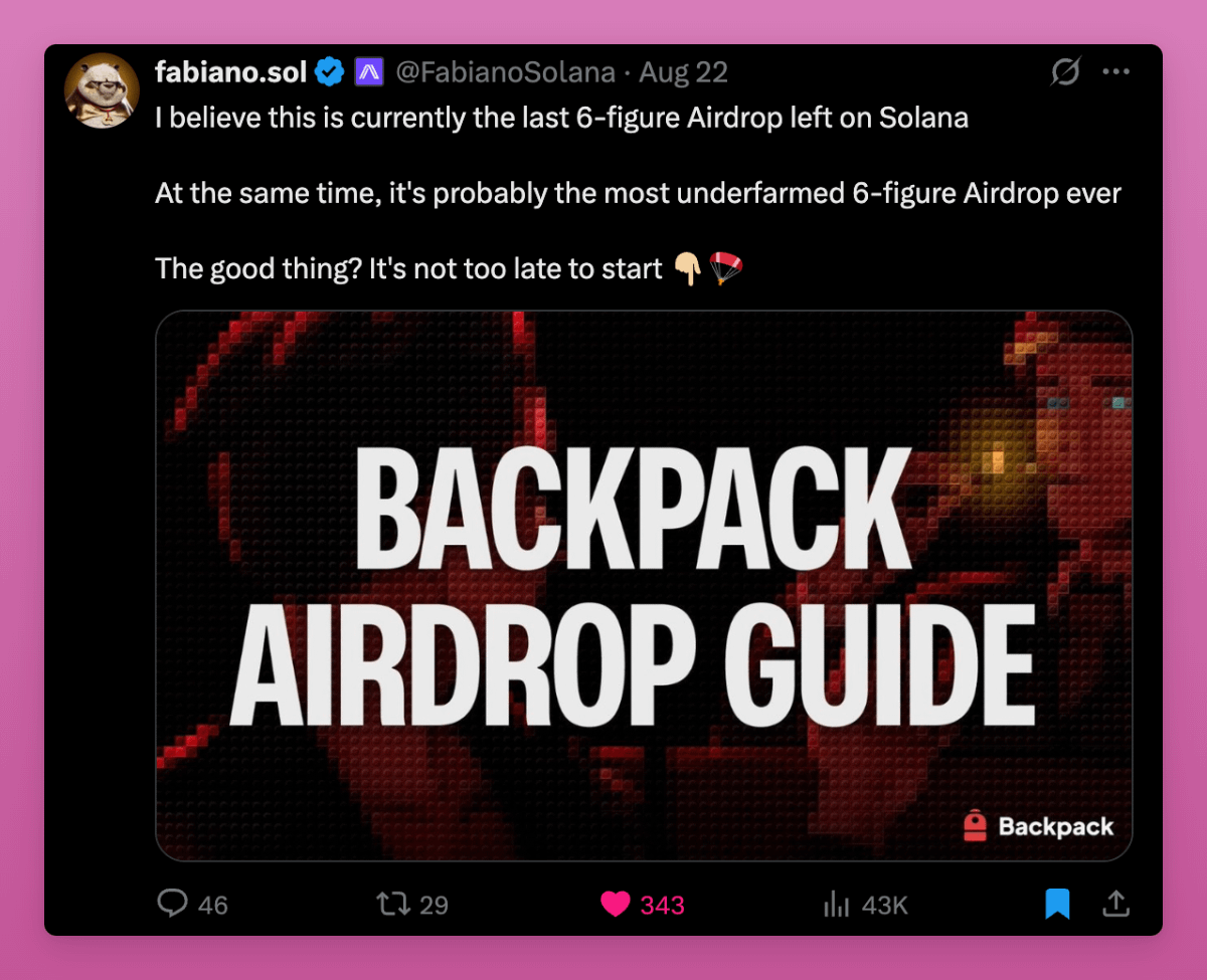 我认同 Fabiano 的观点:这是“Solana 上最后的六位数空投之一”。