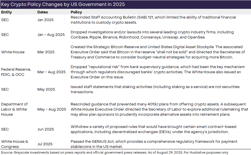 然而,今年美国的政策变化不仅限于稳定币,还涵盖了从加密资产托管到银行监管指导的一系列议题。展望未来,这些政策变化可能进一步推动机构投资者进入加密行业。根据我们的观察,特朗普政府及联邦机构在数字资产领域采取的最重要政策行动已在图 2 中总结。这些政策变化,以及未来可能出台的更多政策,正在引发加密行业的机构投资浪潮(更多详情请参阅《2025 年 3 月:机构连锁反应》)。