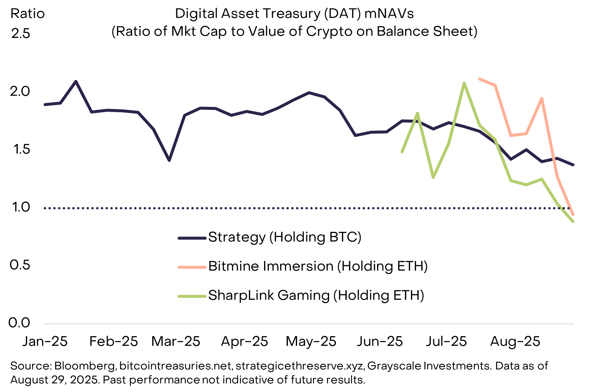 尽管发起人持续提供这些投资工具,但价格表现表明投资者需求可能已趋于饱和。分析师通常会监测其“mNAV”,即公司市值与资产负债表上加密资产价值的比率来衡量供需失衡。如果以公开股权工具形式存在的加密资产需求过剩(即 DAT 不足),mNAV 可能会超过 1.0;如果以公开股权工具形式存在的加密资产供应过剩(即 DAT 过多),mNAV 可能会跌破 1.0。目前,一些大型项目的 mNAV 似乎正在趋于 1.0 ,这表明 DAT 的供需正在趋于平衡(见图 5)。