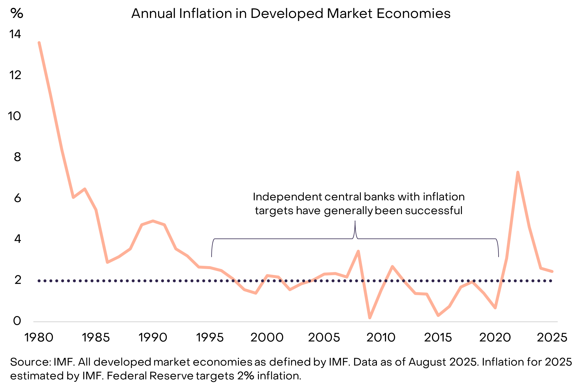 因此,为了让法定货币有效运作,需要确保政府能够履行承诺,不滥用这一体系。美国和大多数发达市场经济体采用的方法是赋予央行明确的目标(通常以通胀目标的形式)和操作独立性。民选官员通常对央行进行一些监督,以确保民主问责。除了新冠疫情后通胀短暂飙升外,自1990年代中期以来,这种明确的目标、操作独立性和民主问责体系在主要经济体实现了低通胀和稳定通胀(图 6)。