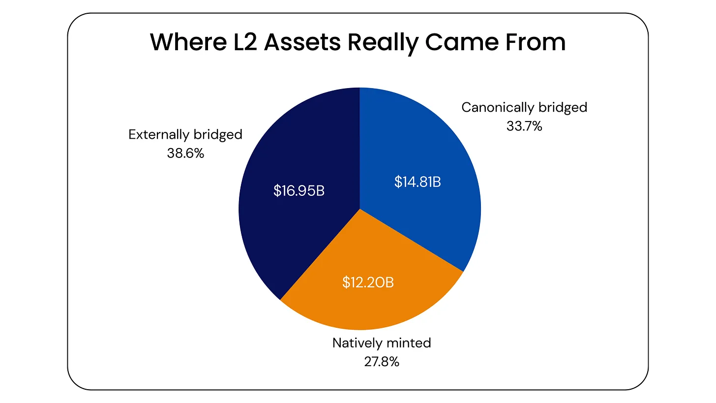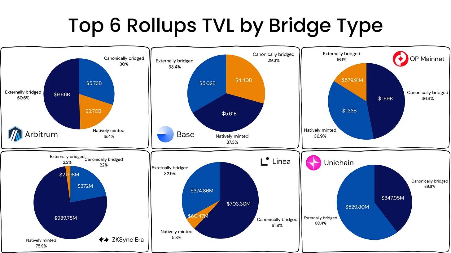 原生发行占主导:如 zkSync Era 和 Base,直接在 L2 上铸造资产(如 Base 上的原生 USDC)并通过直接入口流入。