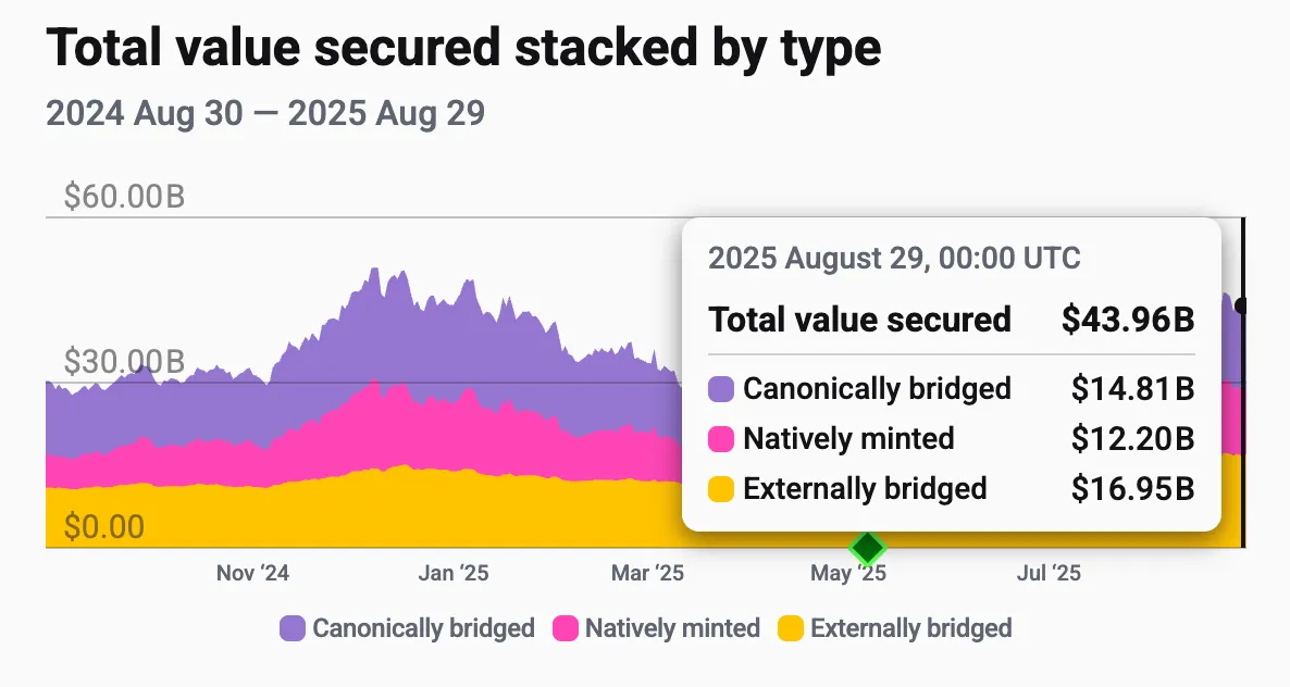 外部桥接从 2023 年后期开始急剧增长,到 2025 年初超越官方桥接,标志着以太坊失去 Rollup 资产的多数份额。