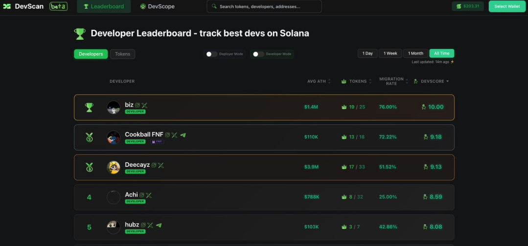 目前,https://devscan.wtf 与 https://www.devscan.tech 等网站已做出初步尝试,会展示「顶级高频发行者」及其相关数据。
