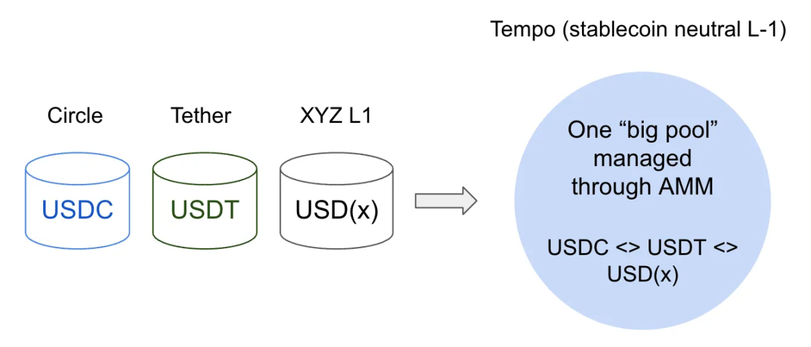 Stripe 的 Tempo:选择了不同的路径,保持「稳定币中立」。它不绑定某一种稳定币,而是通过内置自动做市商(AMM)支持多种美元稳定币,这对追求灵活性的开发者、以及不局限于某一种美元代币的用户来说,吸引力可能更强。