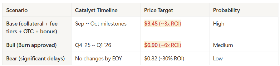 • Bybit 整合的关键催化剂包括增强的抵押品使用、VIP 费用等级和潜在的回购与销毁机制,大部分将在 2025 年 9 月底前推出。