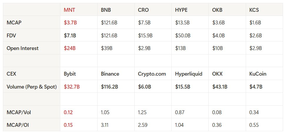 尽管执行延迟、对 Bybit 的依赖以及 L2 竞争等风险依然存在,但 MNT 的估值指标明显落后于 BNB、OKB、CRO 和 HYPE 等同行竞争者。