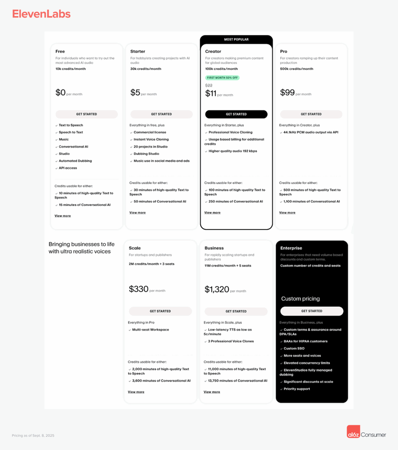 ElevenLabs是一个很好的例子:该公司开始时大量使用消费者,但迅速构建企业级能力,为其语音和对话代理添加HIPAA合规性,并定位自己为医疗保健和其他受监管市场提供服务。这种快速的企业化转型让他们能够抓住高价值的企业客户,而不仅仅依赖消费级收入。