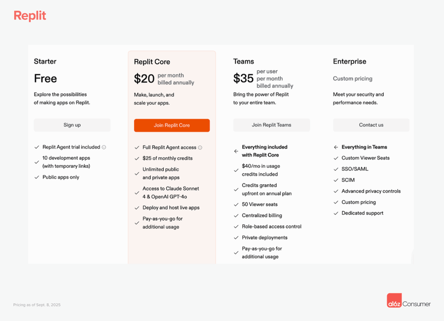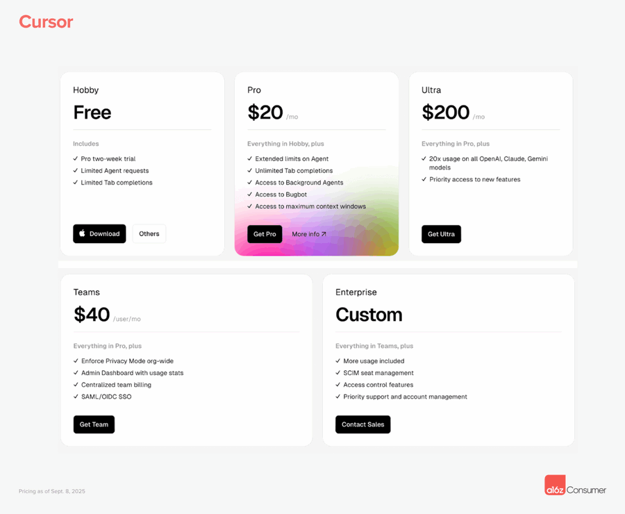 Replit为Core用户提供每月20美元的计划。团队计划从每月35美元开始,包括额外积分、查看器席位、集中计费、基于角色的访问控制、私有部署等。Cursor提供每月20美元的Pro计划和每月200美元的Ultra计划(使用量增加20倍)。团队用户为Pro产品支付每月40美元,配有组织范围的隐私模式、使用和管理仪表板、集中计费和SAML/SSO。