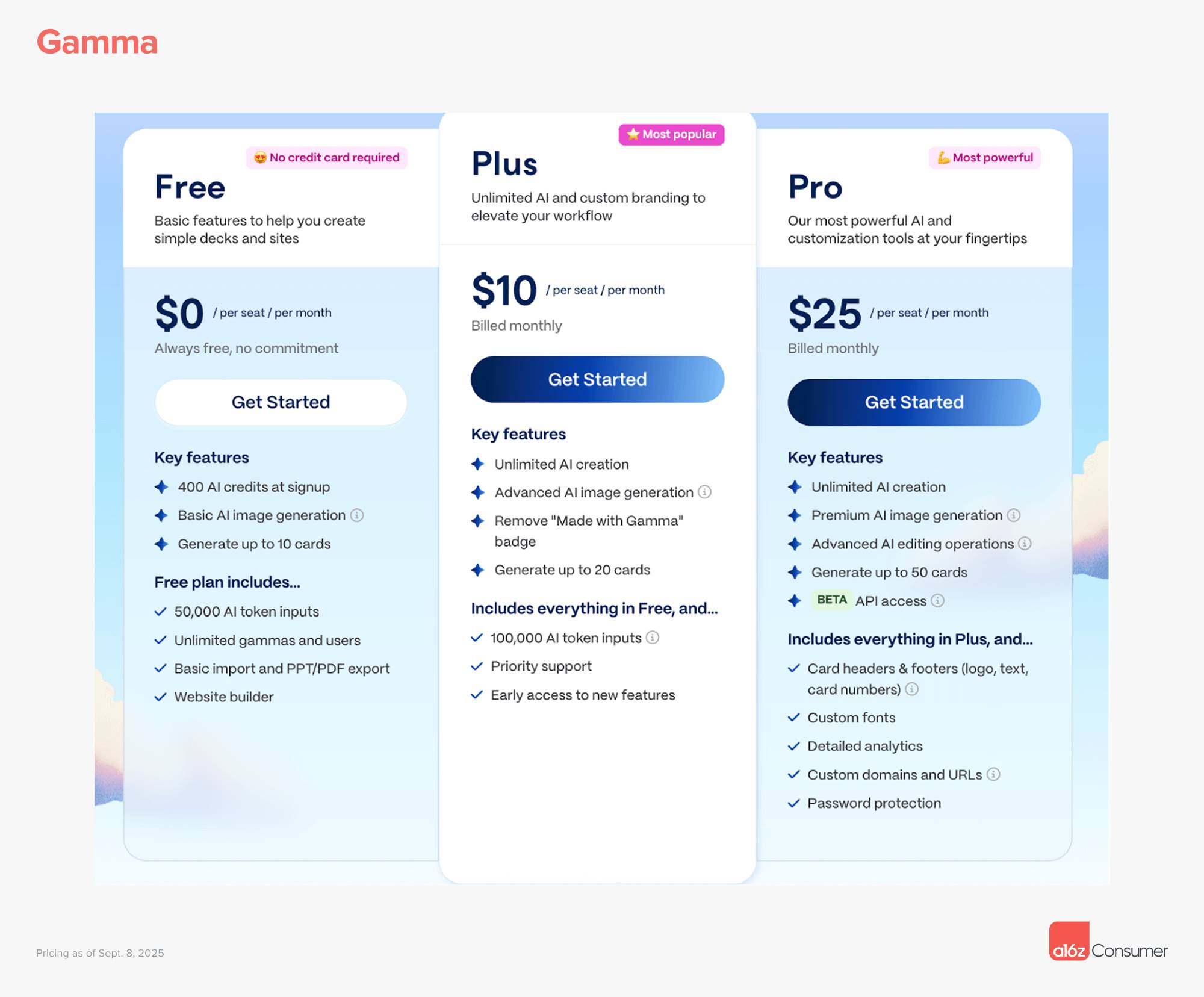 让我看看一些具体例子。Gamma的Plus计划每月8美元,用于去除水印——这是大多数企业使用的要求——以及其他功能。然后用户为添加到其工作空间的每个协作者付费。这种模式聪明地利用了企业对专业外观的需求。