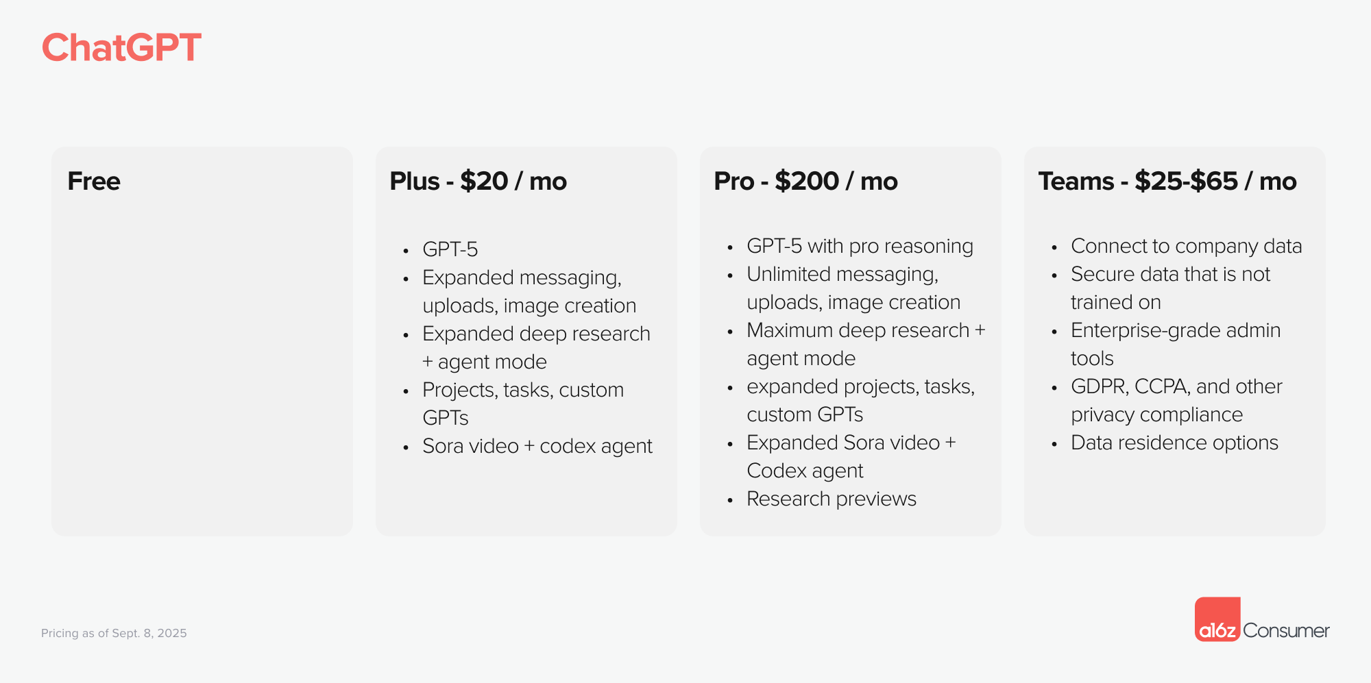 配备了这些功能,定价差异可以是巨大的。ChatGPT就是一个很好的例子,虽然它不被广泛认为是团队产品,但其定价突出了差异:个人订阅每月20美元,而企业计划范围从每用户25美元到60美元。这种2-3倍的价格差异在传统消费级软件中很少见,但在AI时代却变得常见。
