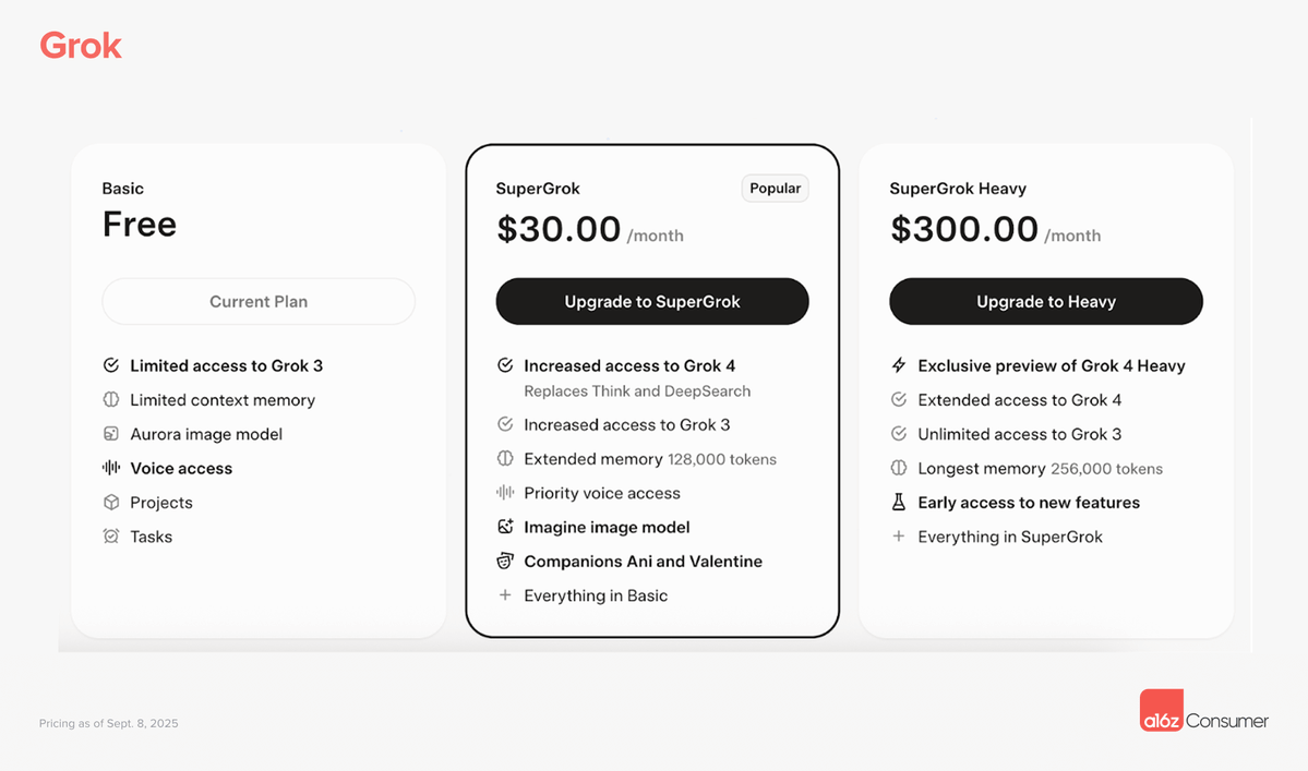 Grok的定价更是把这种策略推到了极致:SuperGrok计划每月30美元,SuperGrok Heavy计划每月300美元,后者解锁新模型(Grok 4 Heavy)、模型的扩展访问、更长的记忆和新功能测试。这种10倍的价格差异在传统消费级软件中几乎是不可想象的,但在AI时代却变得合理,因为不同用户的需求和价值感知差异巨大。