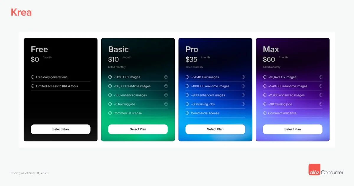 Krea的模式也很有趣,他们提供每月10-60美元的计划,基于预期使用量和训练作业,如果你超过了包含的计算单位,还可以购买5-40美元的额外积分包(有效期90天)。这种模式的精妙之处在于,它既为轻度用户提供了合理的入门价格,又为重度用户提供了扩展空间。