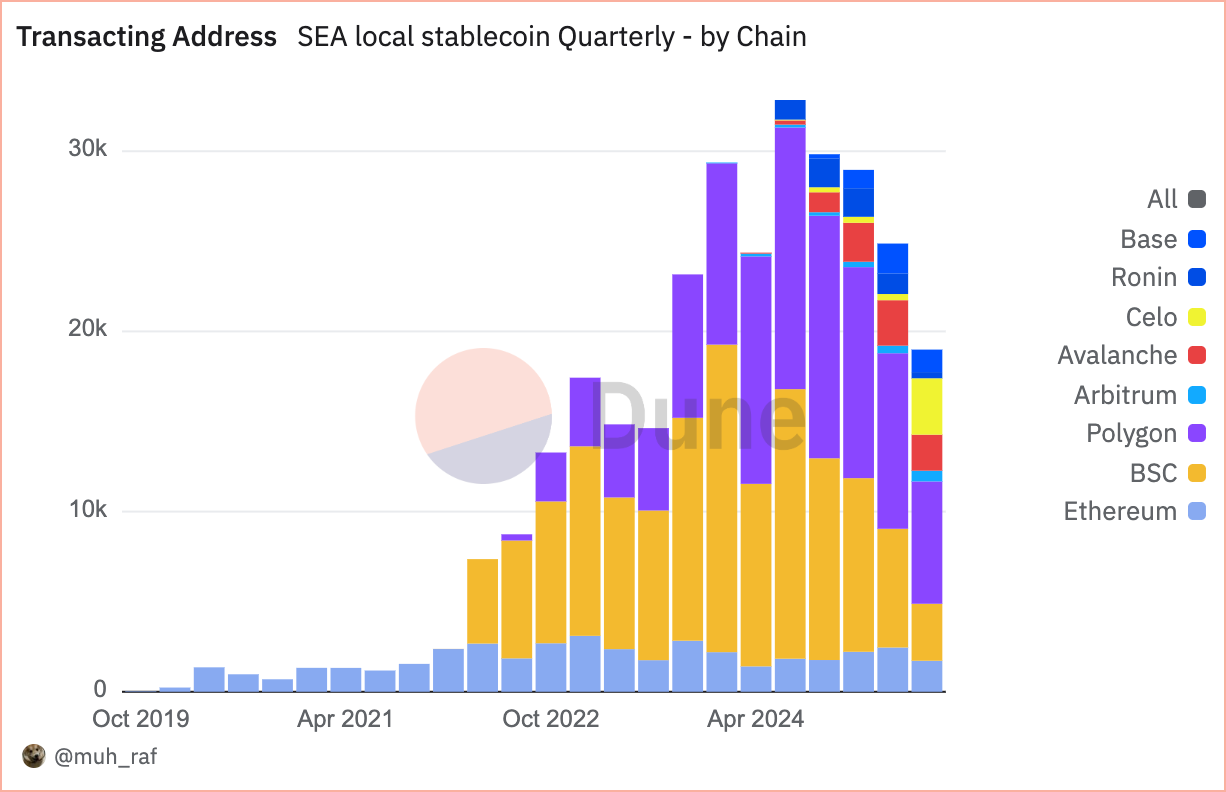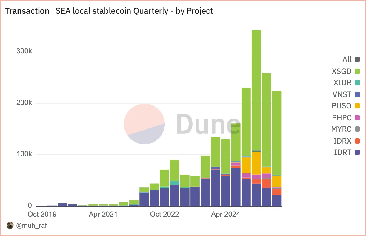 自 2020 年 1 月以来,东南亚地区非美元稳定币的采用率迅速上升,从最初的 2 个项目增长到 2025 年的 8 个项目。这一增长得益于交易量的增加以及多样化区块链平台的使用。