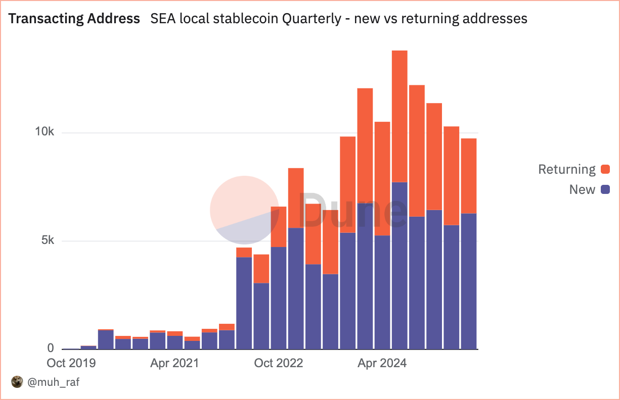 自 2025 年第二季度以来,东南亚的非美元稳定币得到了广泛的采用,活跃(交易)地址数量显著增加,超过 10,000 个,其中,4,558个为回访地址,5,743个为新增地址,显示出稳定币用户的稳步增长和参与度提升。