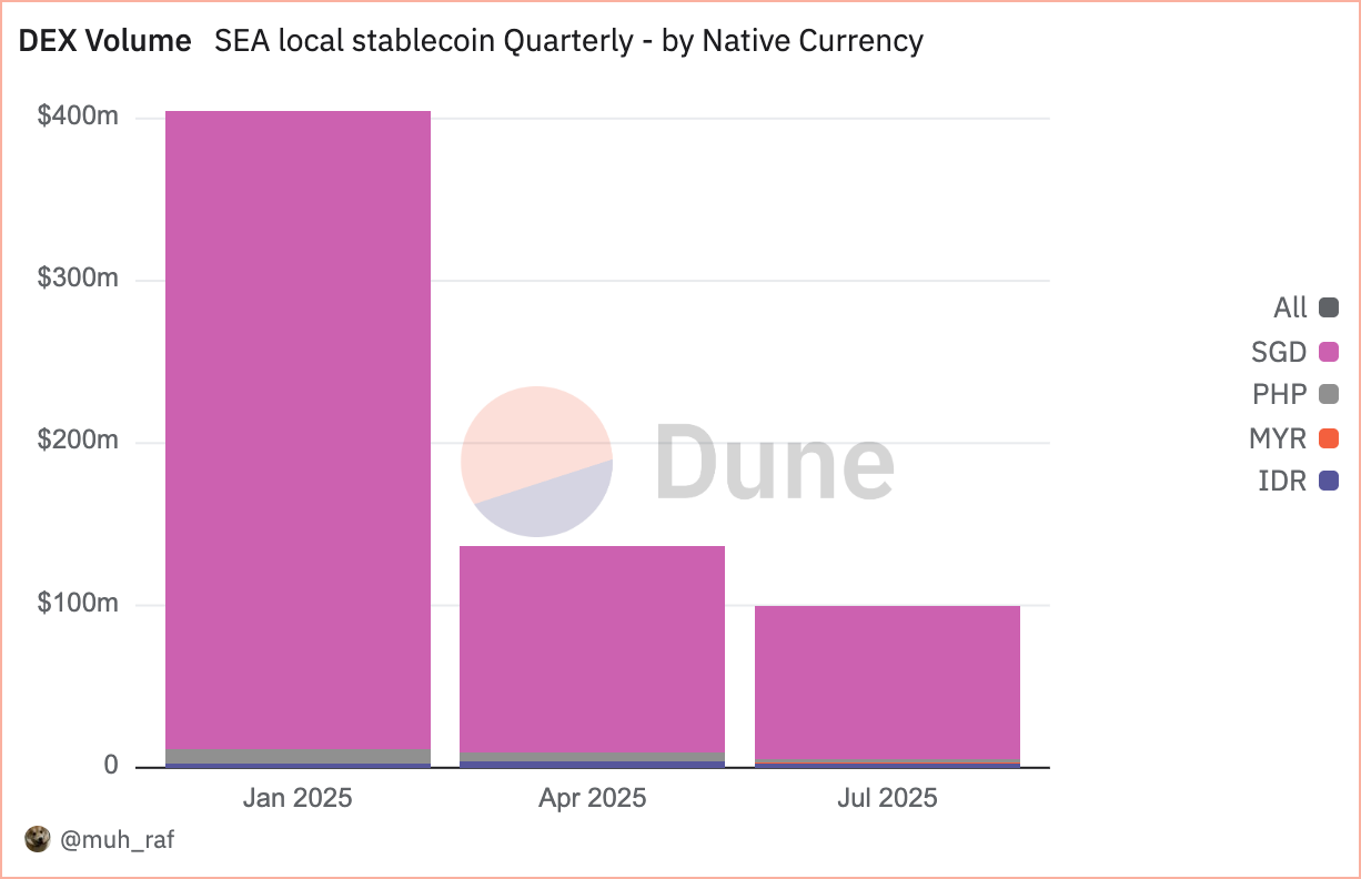 如前所述,2025 年第二季度,按本币计算的 DEX 交易量达到 1.32 亿美元,其中,以新加坡元挂钩的稳定币为主导,主导了东南亚非美元稳定币市场。以新加坡元计价的资产占比93.1%(1.27 亿美元),其次是菲律宾比索 (PHP),占比 3.9%(500 万美元),以及印尼盾 (IDR),占比 2.7%(360 万美元)。这凸显了新加坡元在区域 DEX 活动中的主导地位。