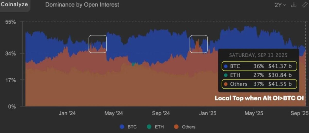 自去年 12 月以来,另类投资(除比特币以外的加密货币)的未平仓合约量首次超过比特币;而历史上最后两次出现这一现象时,市场均恰好迎来了局部顶部。