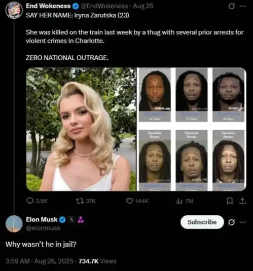 正是在 9 月 10 日的下午 3 点,马斯克在 Twitter 上表示,他愿意捐出 100 万美元,支持在美国主要城市创作 Iryna Zarutska 壁面的激励活动。