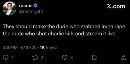 「应该做场直播,让 Iryna 案的凶手在直播中干 Charlie 案的凶手。」Rasmr 已经删除了这条推文