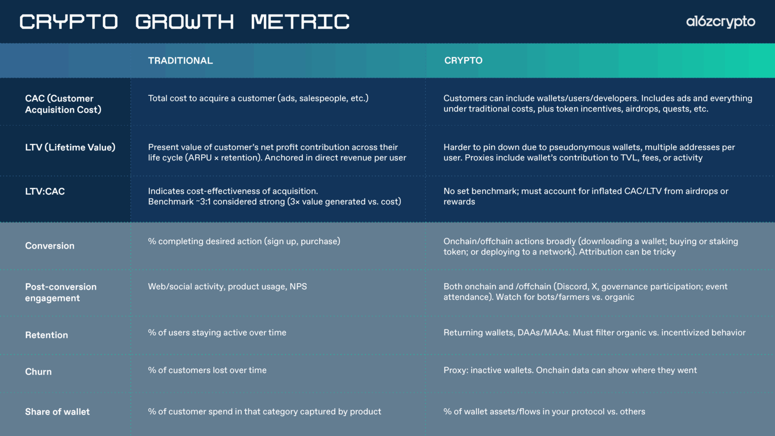 对于传统的 SaaS 产品来说,3:1 的比例被认为是合理的,因为这意味着你从客户身上创造的价值是获取客户成本的三倍,剩余的利润可以再投资于增长。在加密货币领域,我们还没有建立这样的基准。