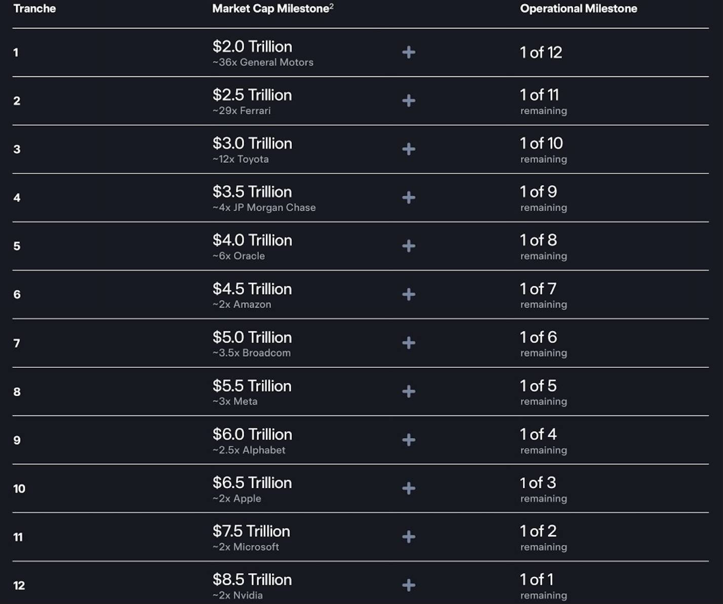 你可以把它想象成一场马斯克为自己量身定制的、难度堪称「地狱级」的闯关游戏。整个计划要在十年内完成,被分成了12个大关卡。每闯过一关,他才能解锁一部分股权奖励。