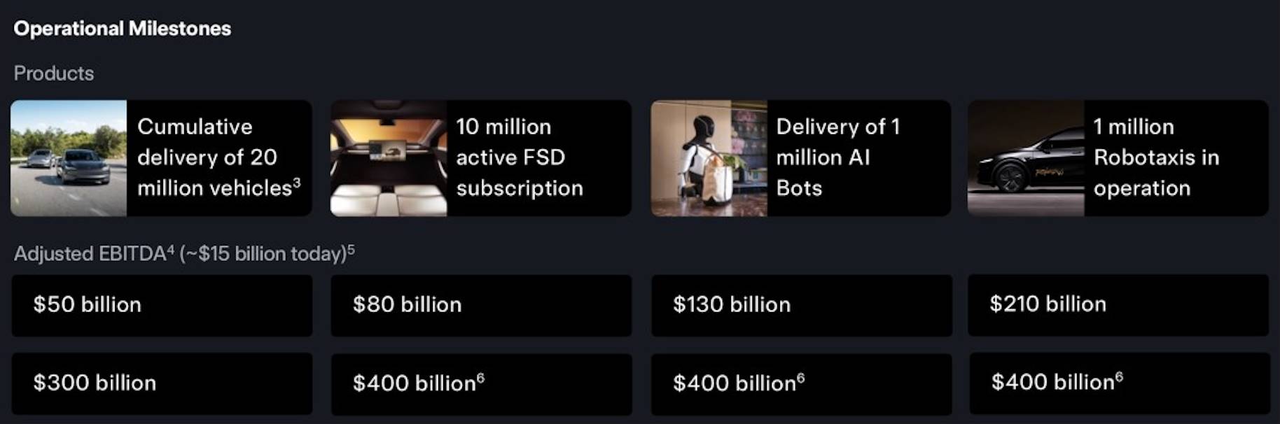 除了上述四大支柱,这个计划还绑定了一系列持续增长的EBITDA(税息折旧及摊销前利润)目标,从500亿美元起步,直至惊人的4000亿美元。这确保了特斯拉在追求规模扩张的同时,必须保持强大的盈利能力和健康的现金流