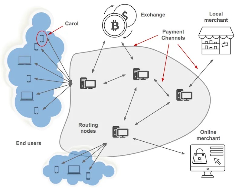 这些通道可以相互连接。如果爱丽丝与鲍勃有通道,鲍勃与卡罗尔有通道,爱丽丝可以通过鲍勃向卡罗尔支付。网络将形成一个互联的支付通道系统,处理即时、低费用的交易。