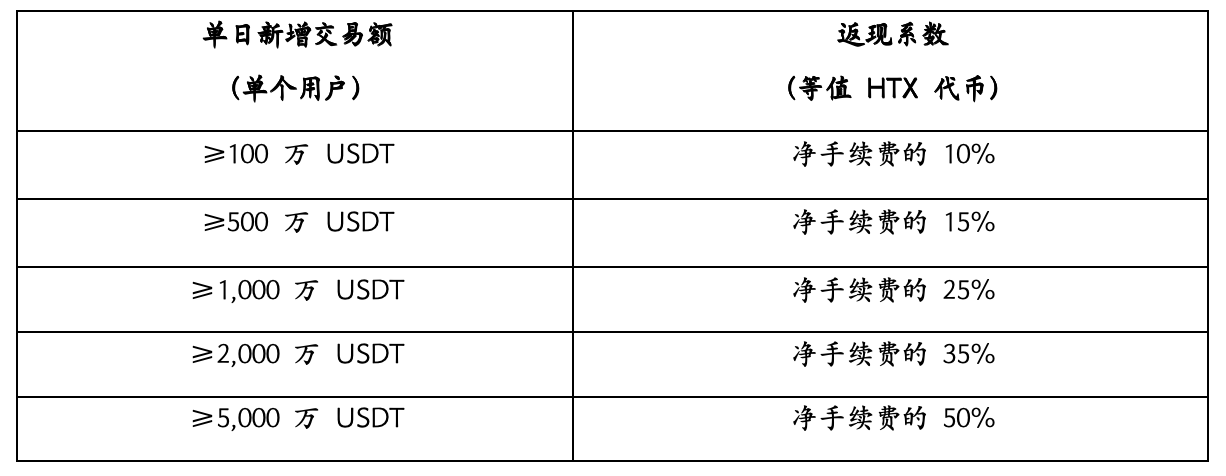 在9月23日现货交易额为6,000万USDT,则用户A当日新增交易额为5,200万USDT;根据返现规则,用户A在当日的返现系数为50%,则用户A在当日应获得【6,000万USDT的净手续费】*【50%】的等值HTX代币返现。