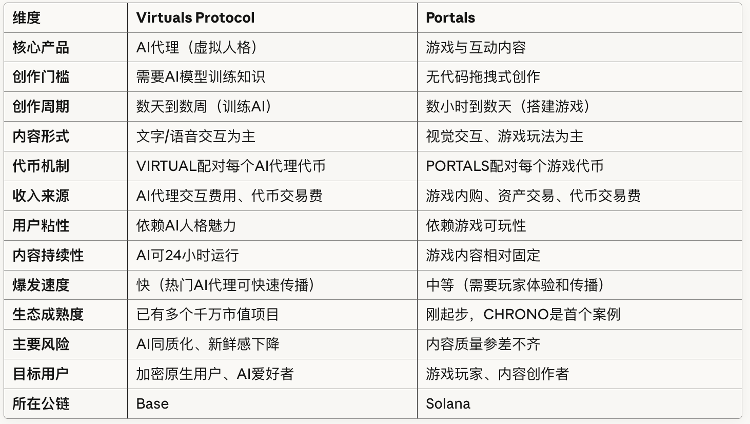 但两个项目共同的挑战,其实都是如何保持内容质量和用户新鲜感。Virtuals需要不断升级AI能力,Portals需要持续产出优质游戏。两者都在探索UGC(用户生成内容)模式在Web3的可能性,只是选择了不同的内容载体。