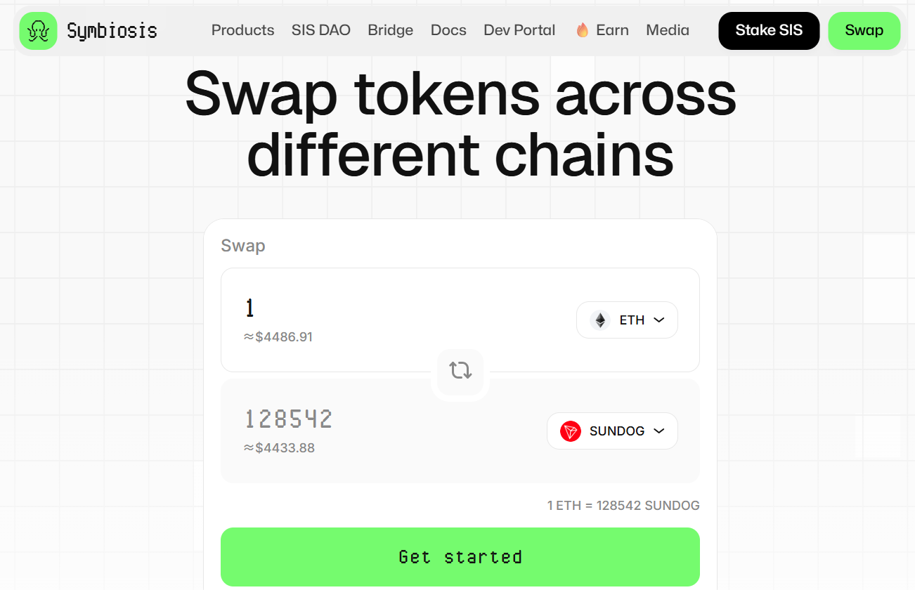 Symbiosis是一种基于AMM的去中心化跨链交换DEX协议,不仅支持同质资产的跨链转移,还可支持跨链交换任意代币对,用户只需在Symbiosis界面选择源链资产和目标链资产,协议便会自动完成源链资产兑换为中间稳定币、跨链转移、再兑换为目标资产等步骤。例如,用户可以直接将以太坊上的ETH兑换成波场TRON链上的USDT、TRX、SUNDOG。