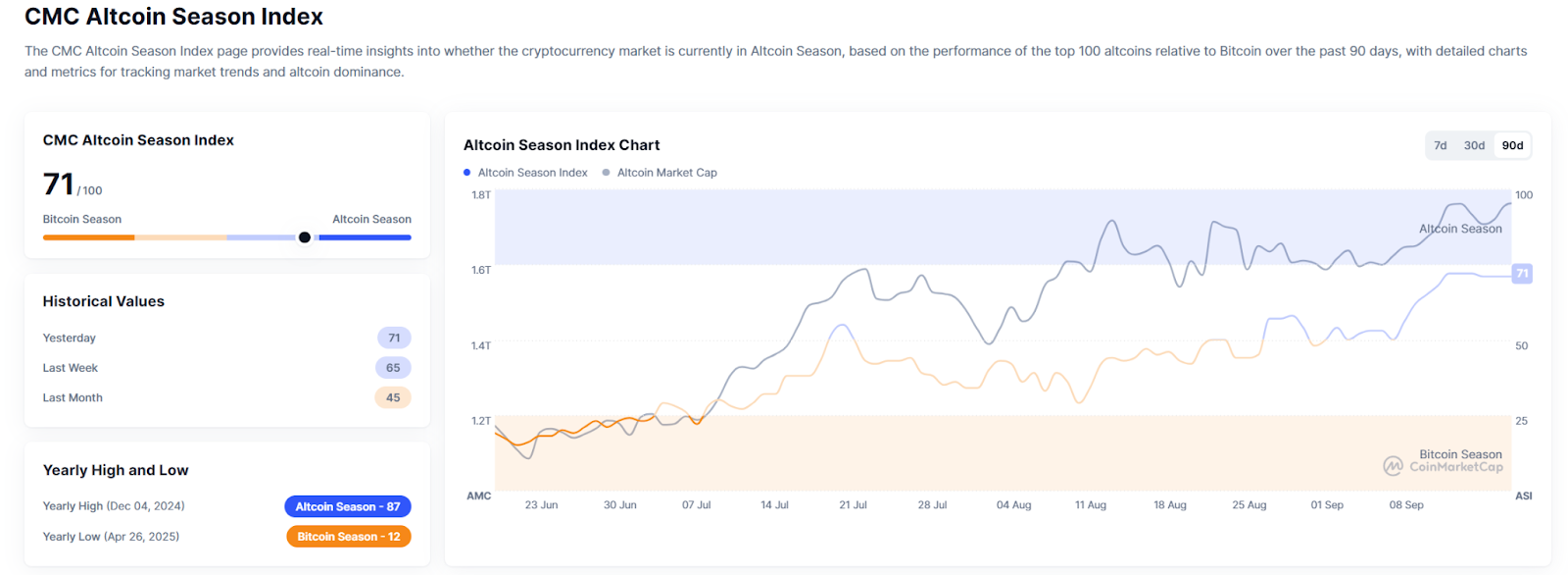 “山寨币季节指数”飙升:一个衡量山寨币相对强弱的重要指标是Altcoin Season Index。该指数统计过去90天内前100大币种有多少跑赢比特币,超过75%则视为进入山寨季。9月18数据显示,山寨季节指数已攀升至71%,这意味着目前仅差3个百分点就确认进入山寨季。今年上半年该指标长期在50%以下,表明比特币显著跑赢大盘。而最近的迅猛攀升说明资金正逐步从比特币转向风险更高的山寨币。历史上类似情形往往发生在比特币强势上涨后横盘整理时期,为山寨币腾出表现空间。如今,比特币在11万美元上下震荡,而大量优质山寨币市值仍远低于历史高点,资金自然嗅到了轮动机会。