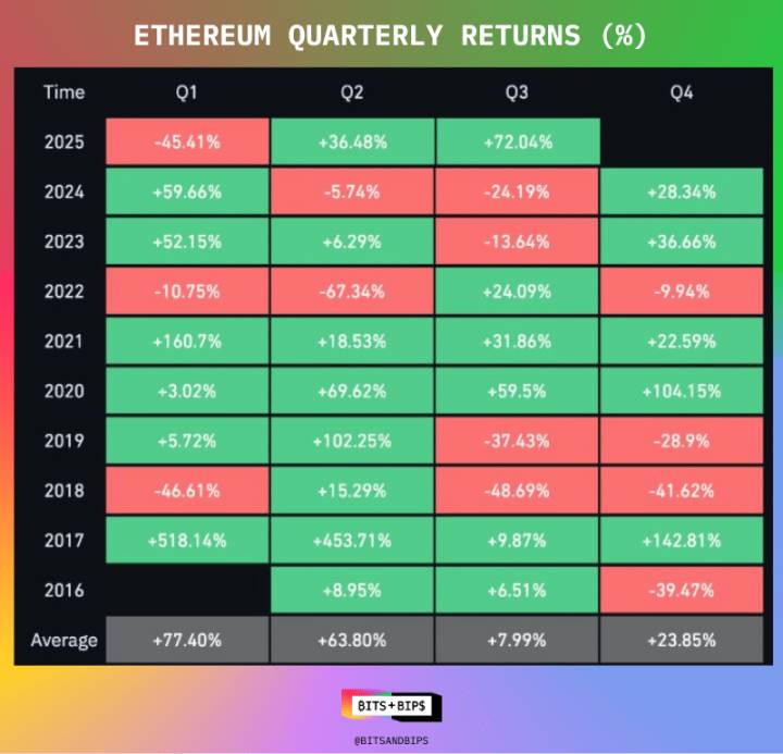 此外,尽管 ETH 今年已实现大幅涨价(年初至今涨幅 36.6%,自 4 月 1 日以来涨幅更是高达 140.59%),但考虑到第四季度是加密货币行业「历史上的看涨周期」,预计 ETH 在今年第四季度仍可能出现新一轮价格上涨。