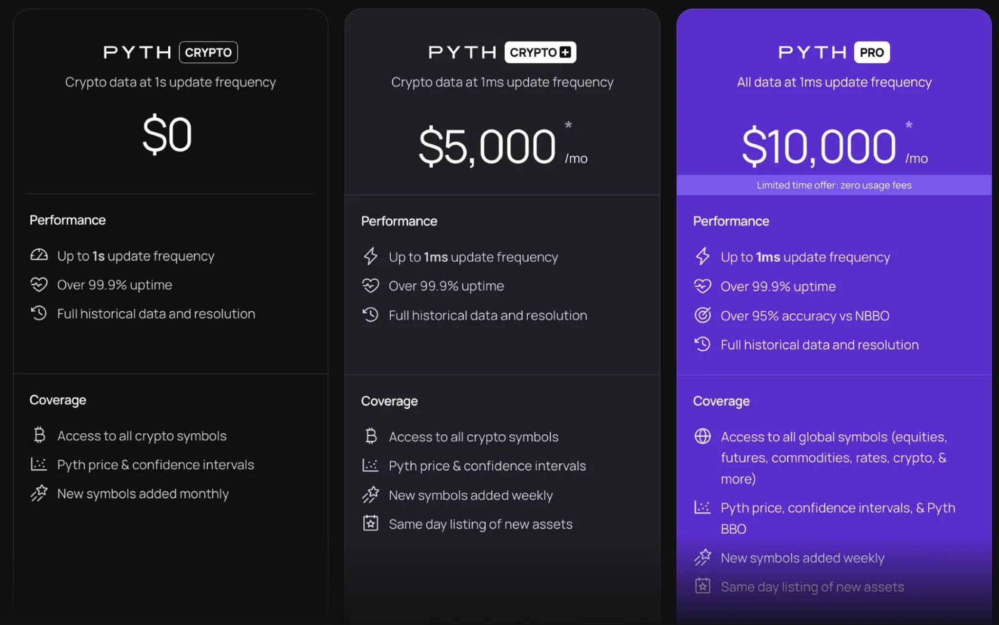 Pyth Pro(每月 10,000 美元):全球跨资产覆盖,每毫秒更新一次,提供企业支持和再分配权利