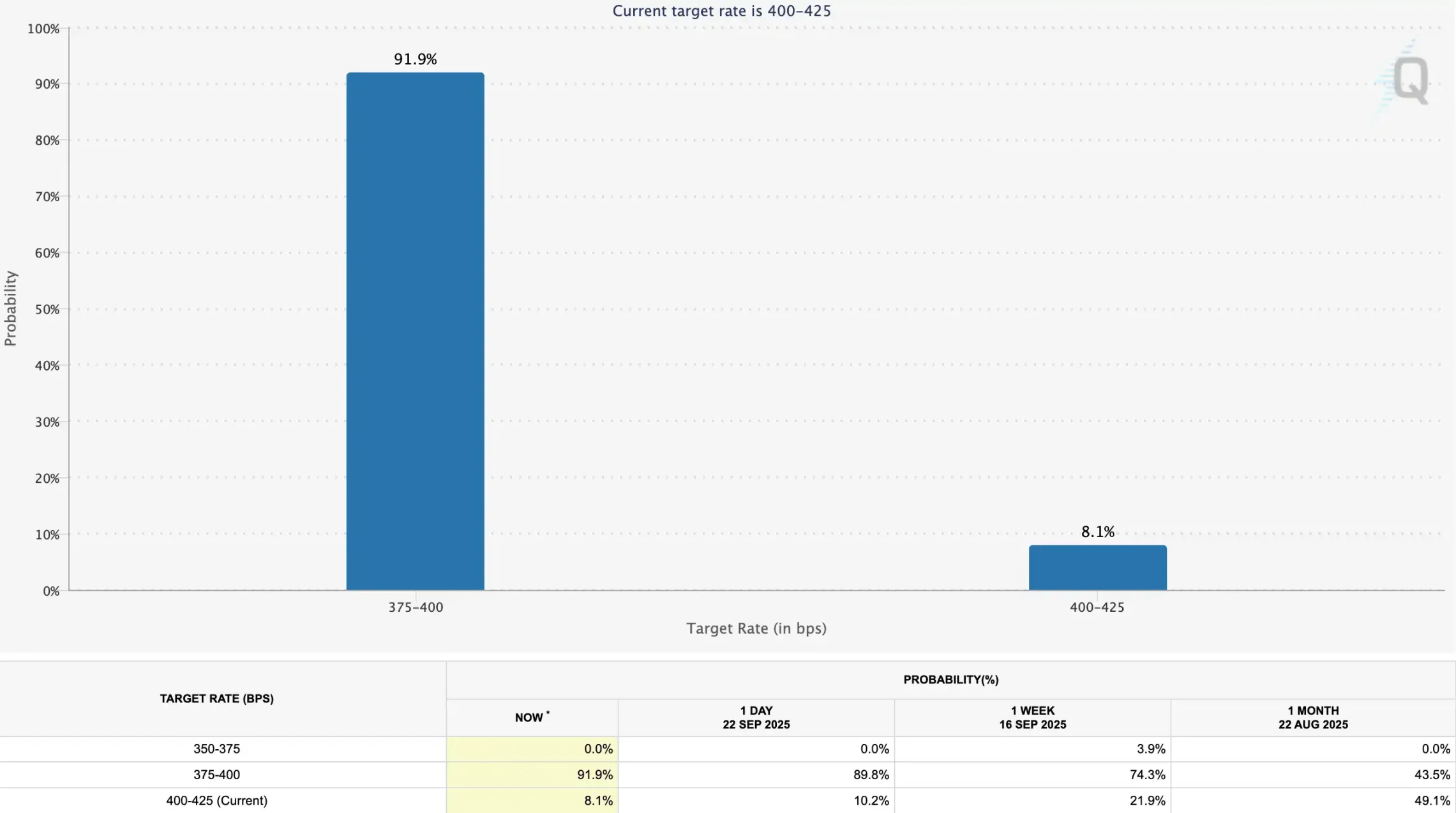 鲍威尔还评价股市的估值相当高,但也强调当前「并非金融风险上升的时期」。对于 10 月的议息会议,鲍威尔表示并没有预设的政策路线。市场将本次讲话解读为「鸽派倾向」:讲话发布后,10 月降息概率由 89.8% 升至 91.9%,市场已基本押注今年将落地三次降息。