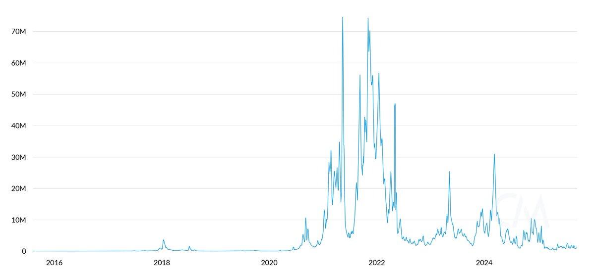 Tom Lee 的论点认为:稳定币和资产代币化活动增加会推高交易量,从而提升 ETH 的手续费收入。表面看似合理,但只要花几分钟查阅数据就会发现事实并非如此。