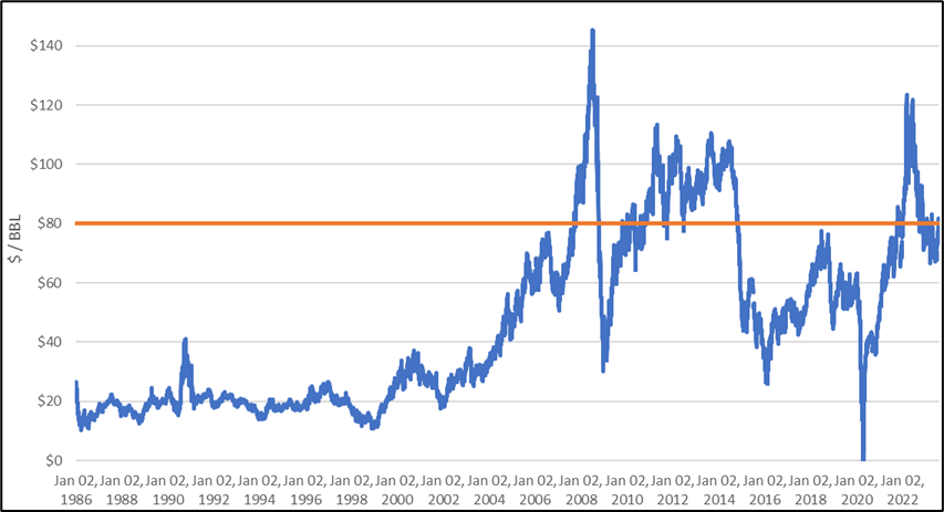 石油本质上是一种商品。经过通胀调整后的真实石油价格在一个世纪以来一直保持在同一区间内,偶尔会出现波动并回归原位。