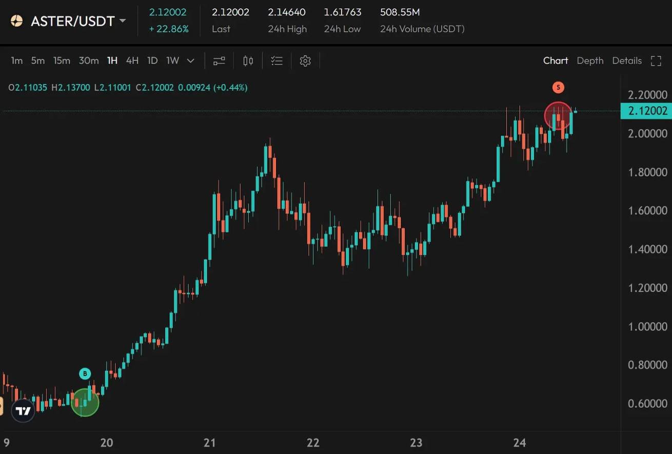 与此同时,Aster 的表现却截然相反。自从我在社群发布入场信号后,其价格直接翻了三倍。正如图表所示,我已落袋部分收益 —— 从 0.06 美元一路持仓至 2.1 美元,相当于短短五天就实现了 3 倍盈利。