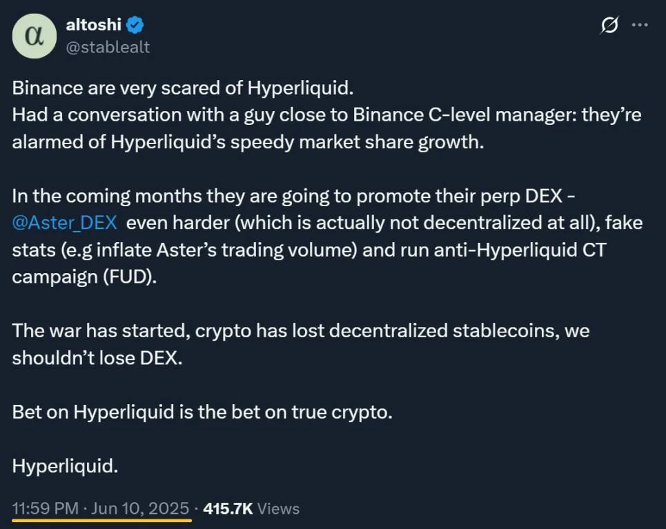 显然,问题的关键不在于币安是否会采取行动,而在于何时行动。过去,他们曾试图通过清算 Hyperliquid 的协议金库来摧毁该平台,但以失败告终。于是,他们转而实施了 B 计划:推出 Aster。