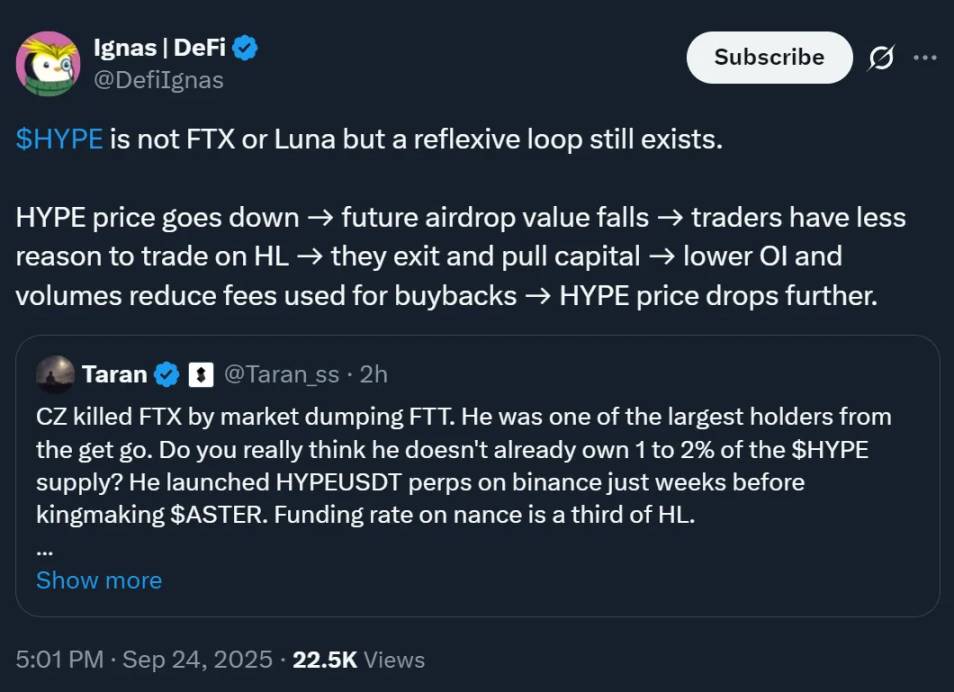 HYPE 虽不是 FTX(加密交易所破产事件)、Luna(算法稳定币崩盘项目)那样的暴雷级项目,但存在「反身性循环」(价格与市场行为相互影响的闭环),循环逻辑如下: