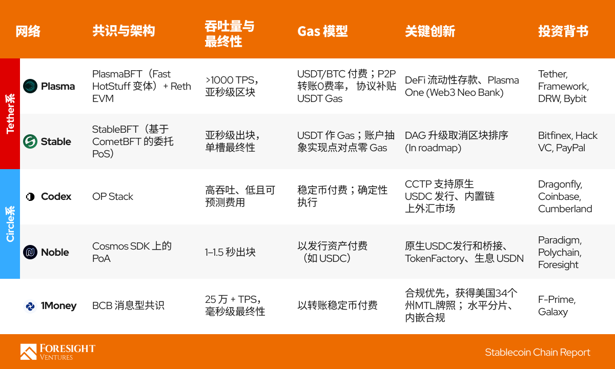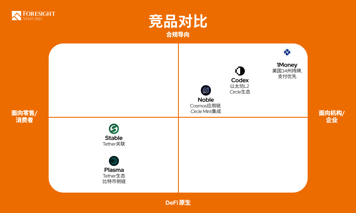 Plasma 和 Stable 都有 Tether/Bitfinex 的背景,倾向于以 USDT 为核心打造支付网络。二者对比来看,Plasma 更强调技术性能突破(零手续费、极高速)和利用比特币安全性背书;Stable 则紧抓美国监管转机,主打合规友好和 USDT 即 Gas 的易用性。相比之下,Codex 和 1Money 走的是企业级 / 合规路线:Codex 依托以太坊 L2,为机构提供可预测费用和现有基础设施衔接(Circle、Coinbase 等);1Money 则从零设计合规架构,甚至放弃智能合约以消除复杂性,直接瞄准跨境支付和零售支付落地。Noble 的策略与它们有所区别,作为 Cosmos 生态的一部分,Noble 立足于多链发行,既扮演了稳定币发行商的合作伙伴(帮助 USDC 等进入 Cosmos)又推出自有稳定币创新(USDN)满足生态内需求 。