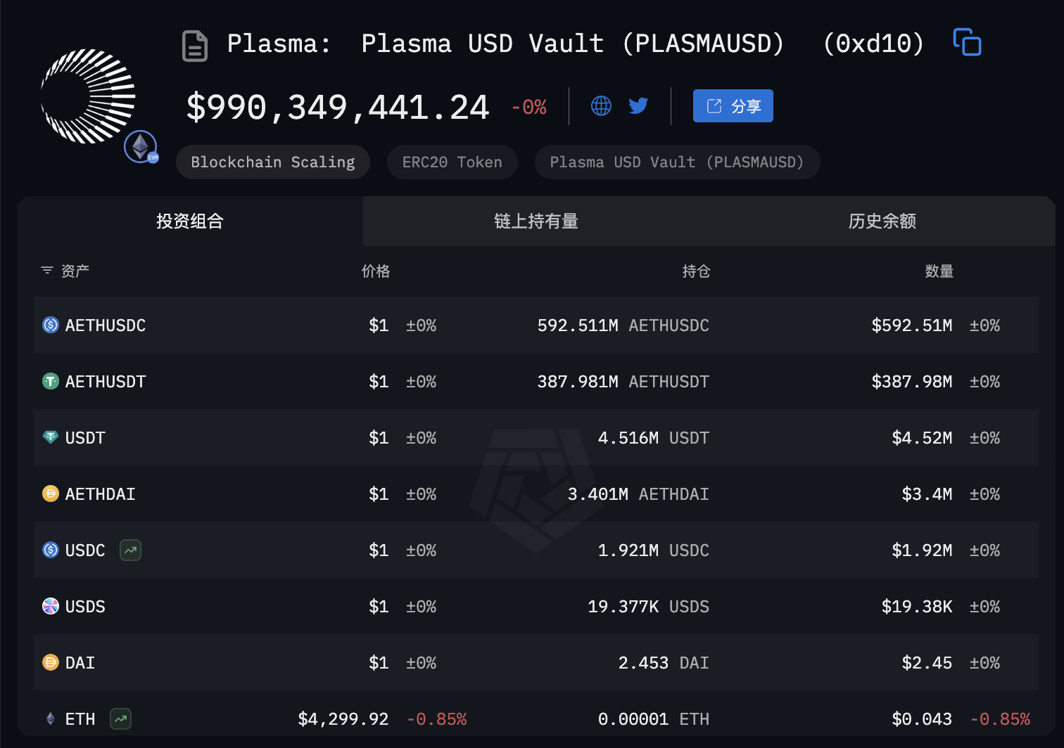 下图显示了 Plasma 网络中稳定币存款的主要构成:核心几乎完全由 AETHUSDC 与 AETHUSDT 两类资产构成,分别占比约 60% 和 39%。