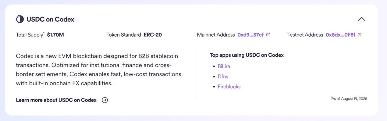 Codex 作为新兴网络,目前链上规模尚不大。目前,我们只能通过 Circle 的多链查询界面看到,Codex 链的原生 USDC 已上线并受 CCTP v2 支持,当前流通量约为 170 万美元。但目前 DefiLlama 等数据聚合网站都尚未单列 Codex 为独立链,因此尚无可比的「DeFi TVL」 统计等,这也与 Codex 侧重 B2B 结算与合规通路,而非泛 DeFi 流动性的定位相一致。以下为 USDC 在 Codex 链上发行的数据: