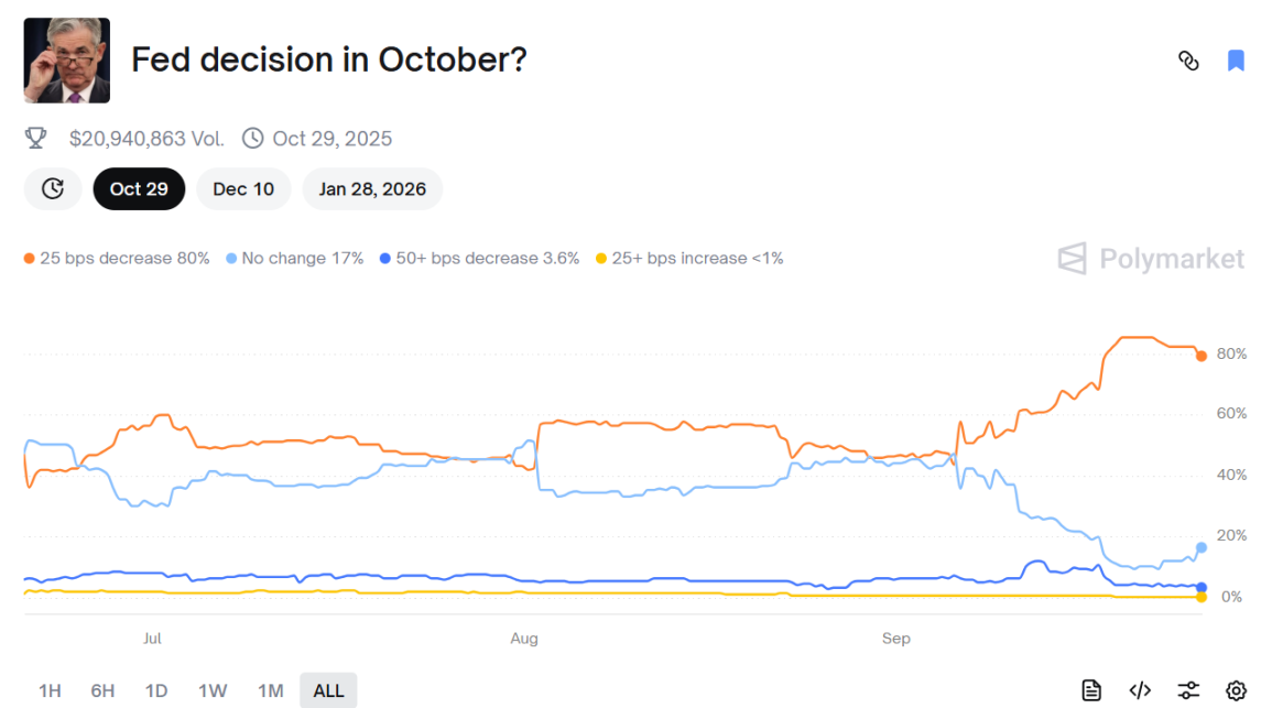 Polymarket 上市场押注美联储降息 25 个基点的概率跌至 80%,不降息的概率升至 17%。