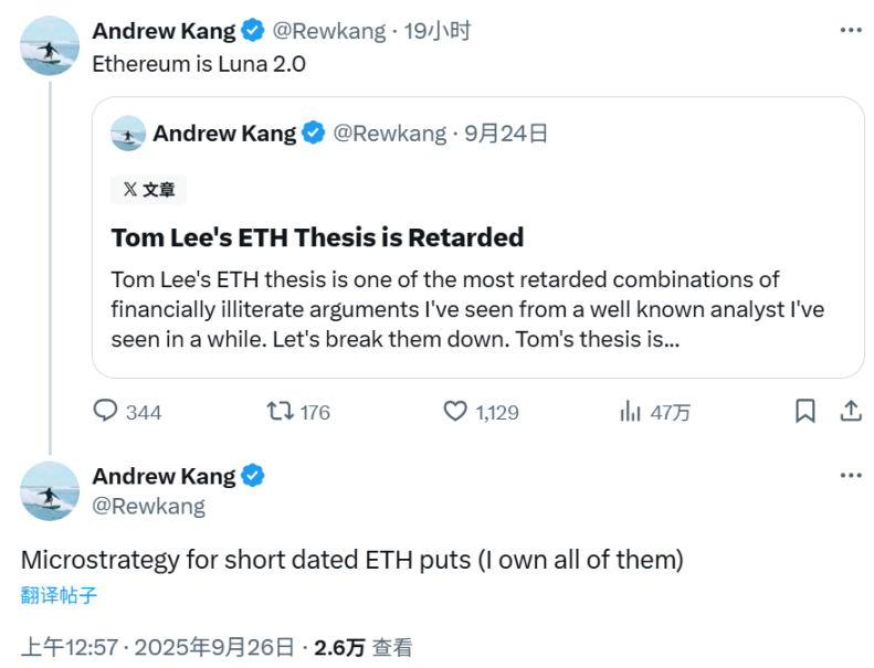加密风投机构 Mechanism Capital 的创始人 Andrew Kang 直言 Tom Lee 关于 ETH 的理论「像个弱智」,并提出五大观点进行驳斥,在业内掀起波澜,即:稳定币与 RWA 的普及并不会带来预期中的收益;以太坊是「数字石油」这个比喻并不准确;机构买入并质押 ETH?纯属幻想;ETH 等同于所有金融基础设施公司总价值?荒谬至极;
