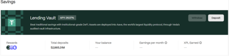存款矿池仅 2 个,分别经由 Veda 和 Term Finance 部署。Veda 是 Plasma 的官方合作伙伴,助其将资产部署至 Aave。目前,Plasma 官方的储蓄金库 APY 高达 26.07%,USDT0 存款金额为 28.6 亿美元。Term Finance 上的存款总额超 3,800 万美元,其将资金分配至 K3 Capital、Tulipa Capital、MEV Capital 及 Shorewoods 四家机构的 USDT0 收益策略,APY 已达 24.66%,包含了 1.73% 的 USDT0 基准收益率。